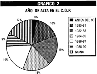 Lo mismo podemos decir considerando el año de licenciatura de los encuestados (gráfico 2l), ya que nos encontramos con que de los titulados antes de 1980 que ahora están en paro, todos han trabajado alguna ve mientras que entre los psicólogos colegiados que han te minado la carrera en los dos últimos años (después de 1988) hay un 72,8 por 100 que nunca lo ha hecho.
